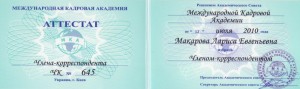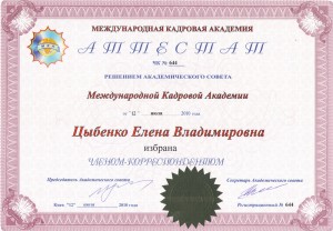 Решением Академического Совета Международной Кадровой Академии 12 июля 2010 г. руководитель КЦ Цыбенко Елена Владимировна и зам. руководителя КЦ Макарова Лариса Евгеньевна избраны член-корреспондентами Международной Кадровой Академии.