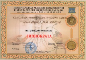 Консультационный Центр (КЦ) Системы 08 февраля 2009 года награжден “Медалью Гиппократа” Международной академии наук экологии и безопасности жизнедеятельности (МАНЭБ) “За подготовку высокопрофессиональных кадров и духовно-нравственную помощь людям; за успешную реализацию, достойные практические результаты и безупречность работы; за успешную реализацию новых, уникальных авторских принципов и методик”.